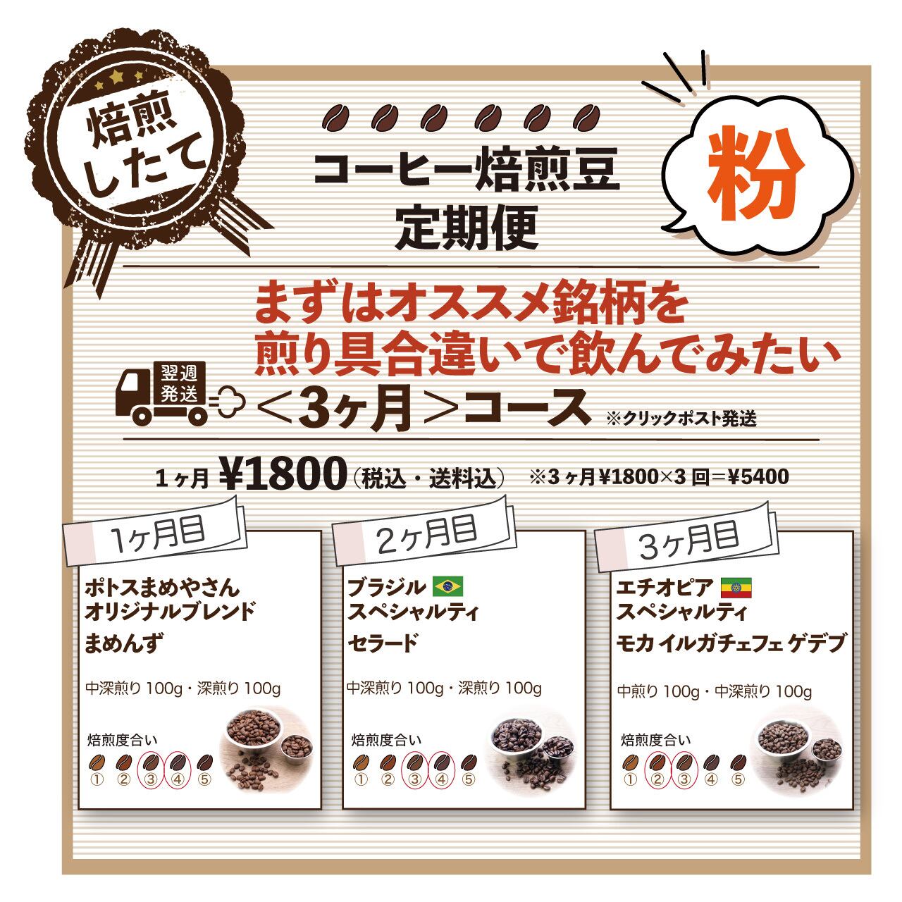 3ヶ月間、月に1回、焙煎度合い違いの2種類(100g×2種類(生豆時の重さ))をお送りします。発送直前に焙煎する鮮度の良いコーヒー豆をお送りします。