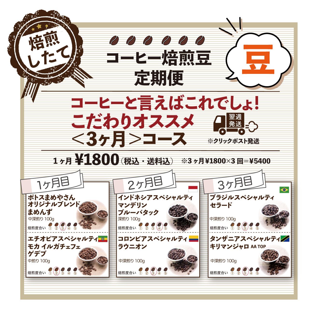 3ヶ月間、月に1回、厳選した銘柄2種類(100g×2種類(生豆時の重さ))をお送りします。発送直前に焙煎する鮮度の良いコーヒー豆をお送りします。